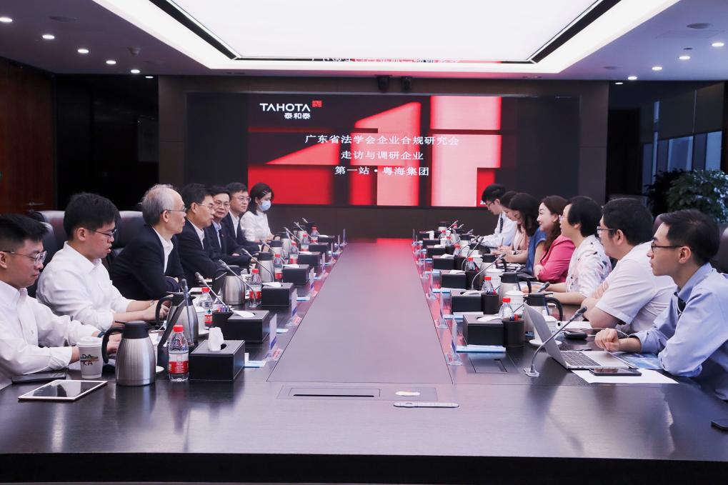 7月6日,广东省法学会企业合规研究会(以下简称“研究会”)开启成立后走访企业活动。首次调研走访活动到了广东粤海控股集团有限公司,企业合规研究会常务副会长兼党支部书记张吕、顾问王荣珍教授、秘书长王烨、副秘书长胡淳与吴漫珊、粤海集团总法律顾问吴明场、法务风控部总经理肖昭义、高级专家乔健康、副总经理乔亚南等参加活动。