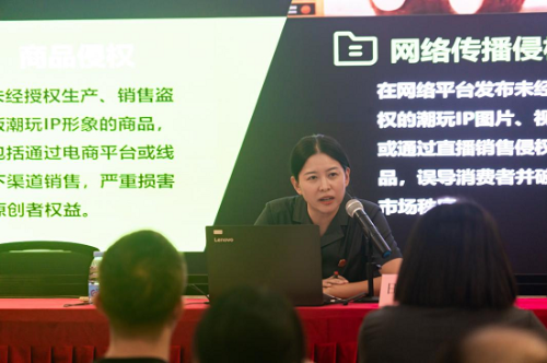 司法护航:潮玩守护的三诊服务。石排法庭深刻认识到传统“事后裁判”的司法模式难以满足潮玩产业的高速发展,为落实“优化法治化营商环境”的决策部署,石排法庭将工作从“被动办案”转向“主动服务”,从“个案治理”升级为“系统治理”,创新推出“问诊-预诊-处方”全链条法治体检服务,以定制化、数据化、专业化举措为企业降风险、护发展,让法治成为潮玩创新的“安全网”。第一,开展定制化“问诊”服务。石排法庭组建专业法官团队,深入潮玩企业开展“一对一”法治体检,针对不同企业精准定位风险点,如为设计企业重点排查IP确权、版权登记漏洞,为代加工企业梳理代加工合同中的质量标准、付款周期等争议条款,为销售企业聚焦盲盒营销、消费者权益保护等合规问题。第二,数据化“预诊”分析。石排法庭设计涵盖潮玩全产业链条风险点的调查问卷,面向辖区潮玩企业开展调研,汇总并整理重点风险问题,为精准施策提供数据支撑。第三,专业化“处方”输出。针对问诊和预诊中发现的问题,石排法庭精准开具“法律处方”,为企业提供专业化解决方案,实现“诊”“治”闭环。